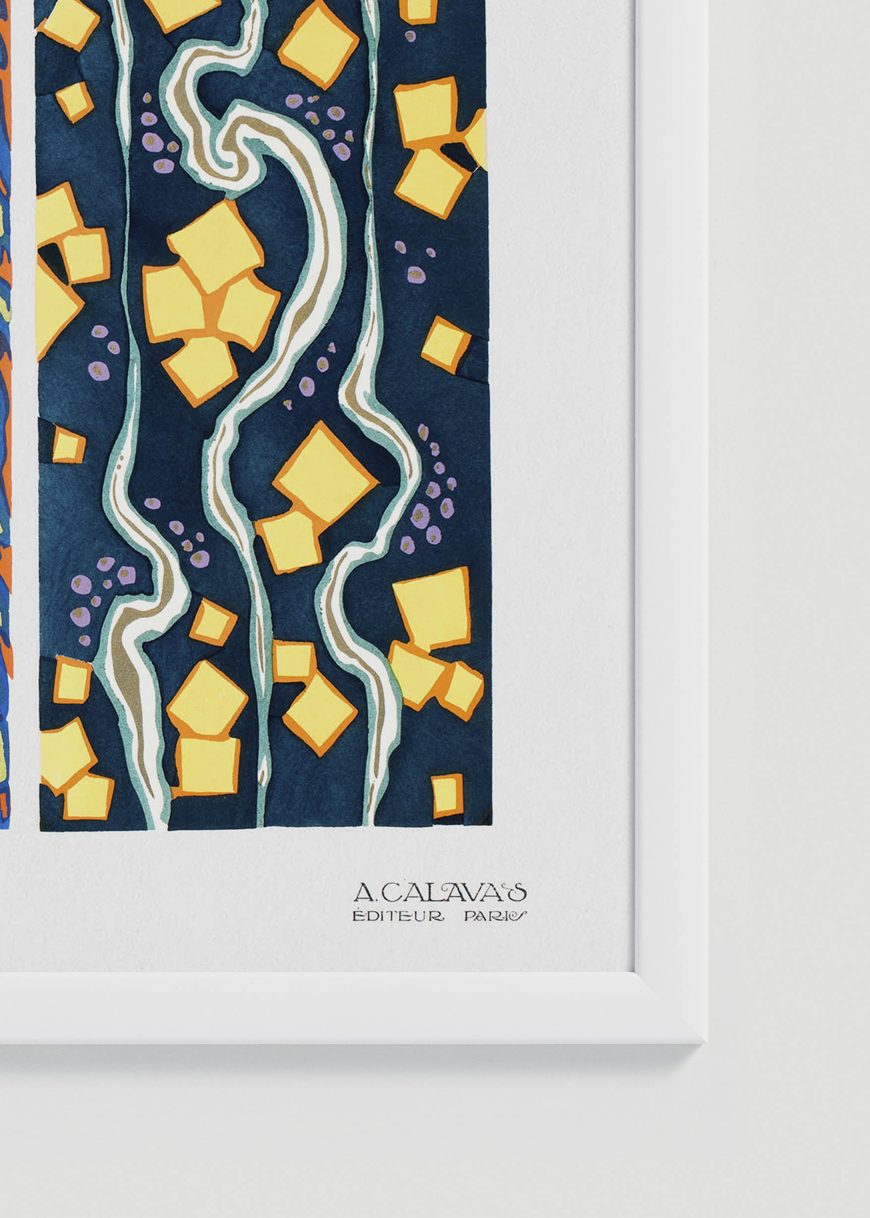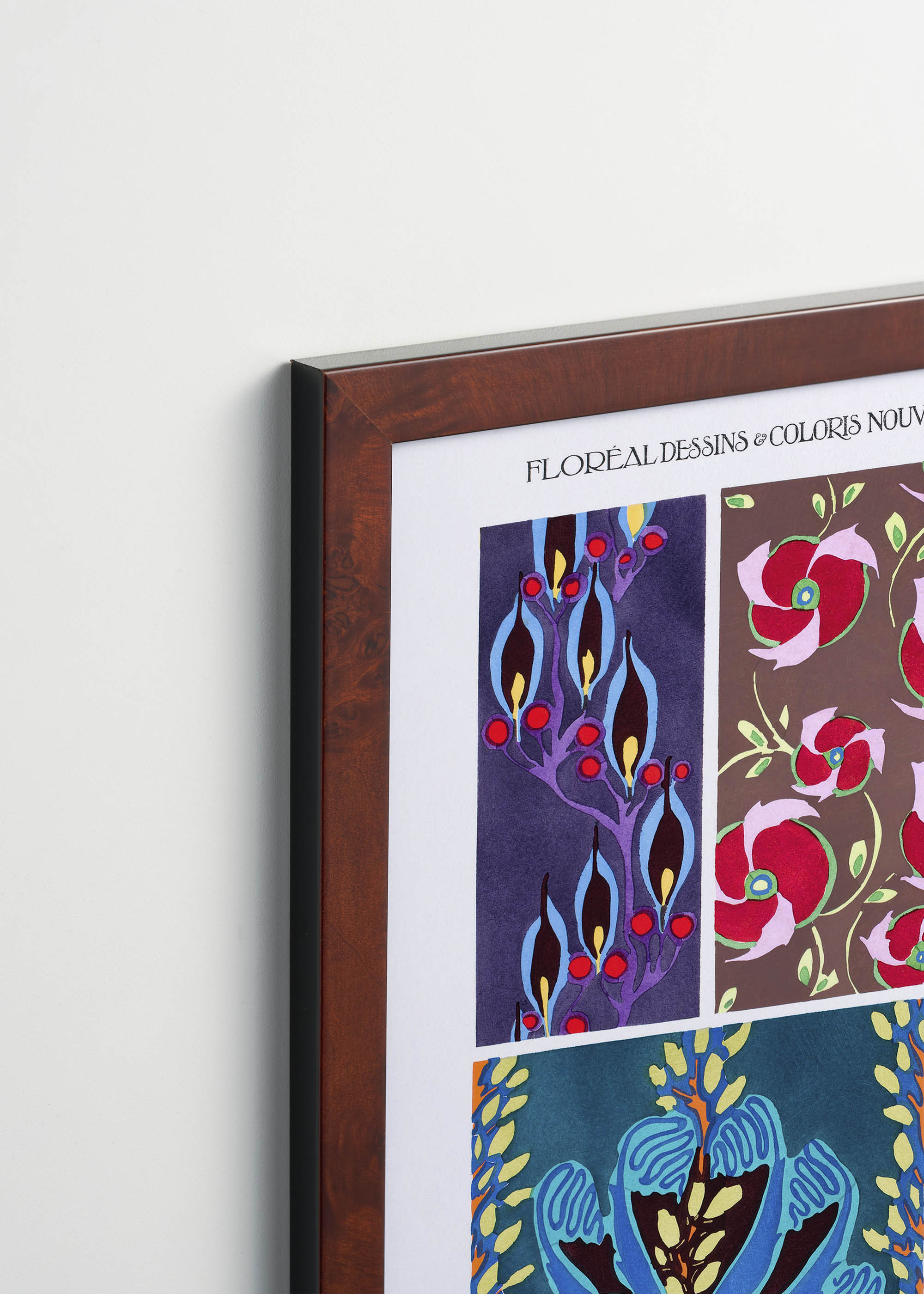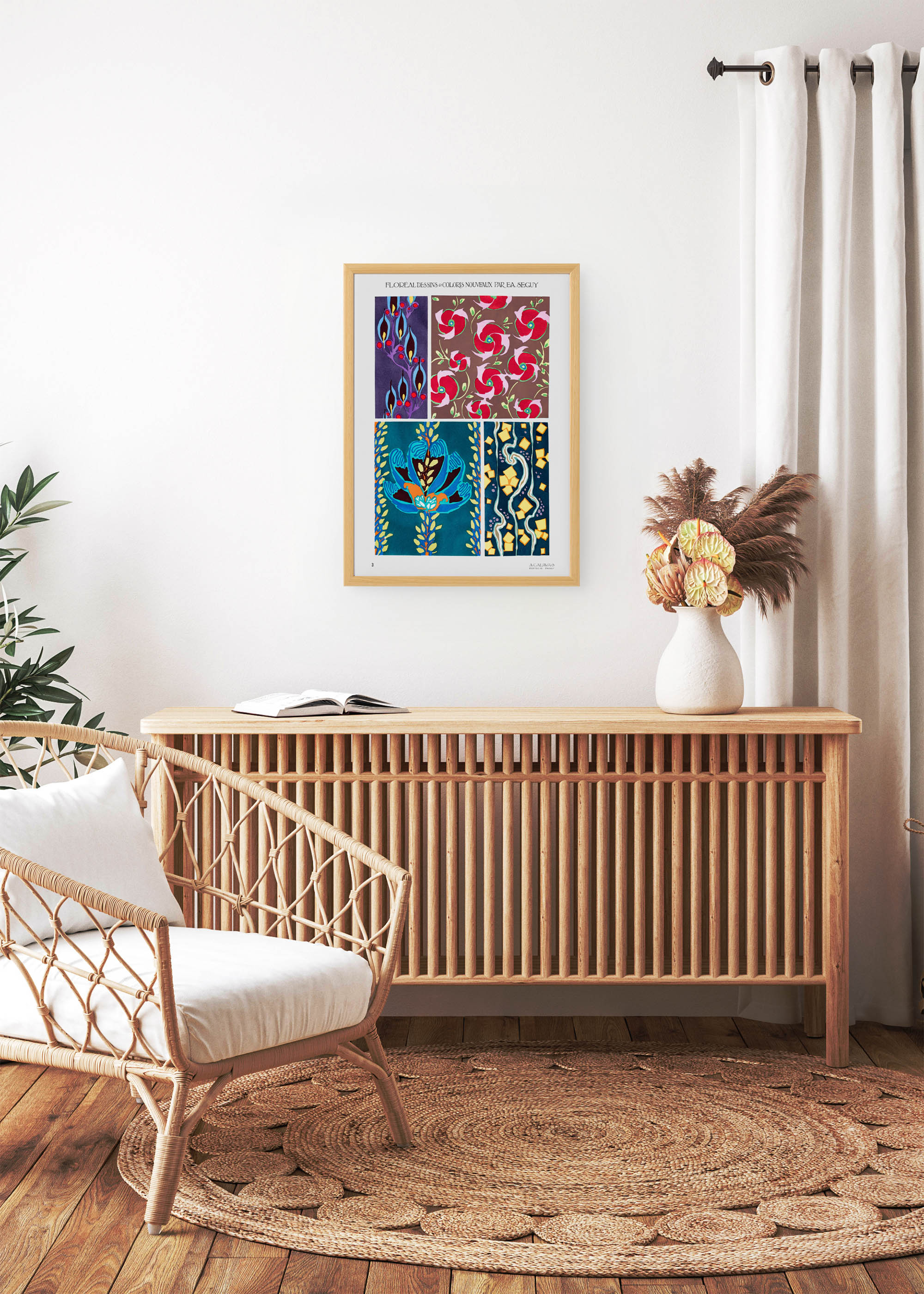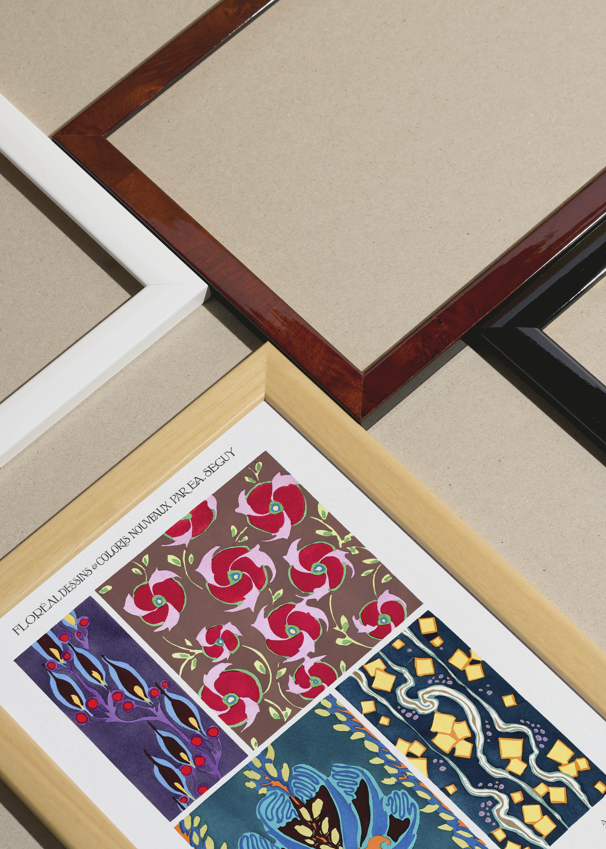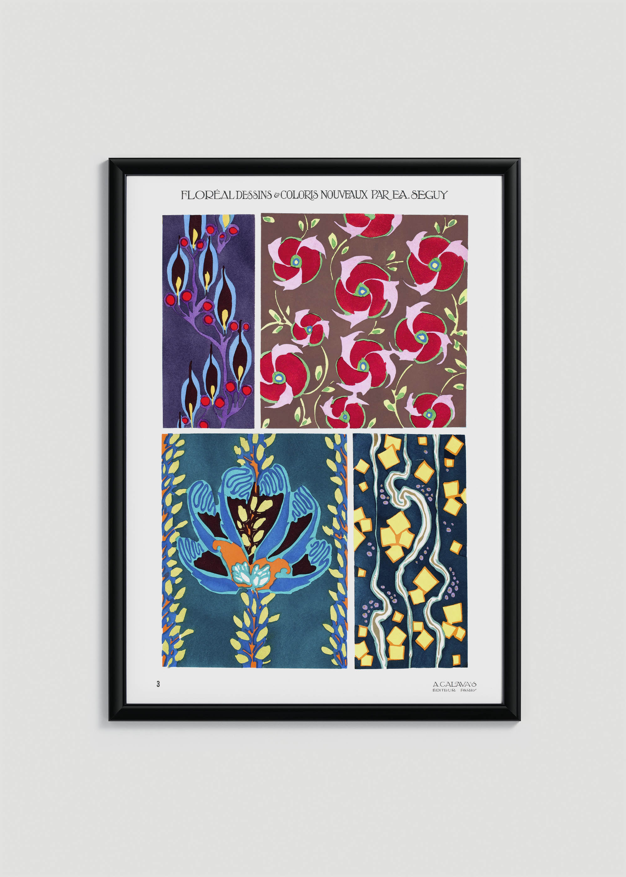 Ten wyjątkowy plakat przedstawia cztery wzory floralne autorstwa E.A. Séguy, pochodzące z kultowej serii „Floreal Dessins & Coloris Nouveaux” wydanej przez paryskie wydawnictwo A. Calavas. Eugène Alain Séguy, francuski entomolog i artysta dekoracyjny z początku XX wieku, zasłynął z harmonijnego łączenia obserwacji naukowej z artystyczną wizją, tworząc wzory, które do dziś inspirują projektantów i miłośników Art Déco.