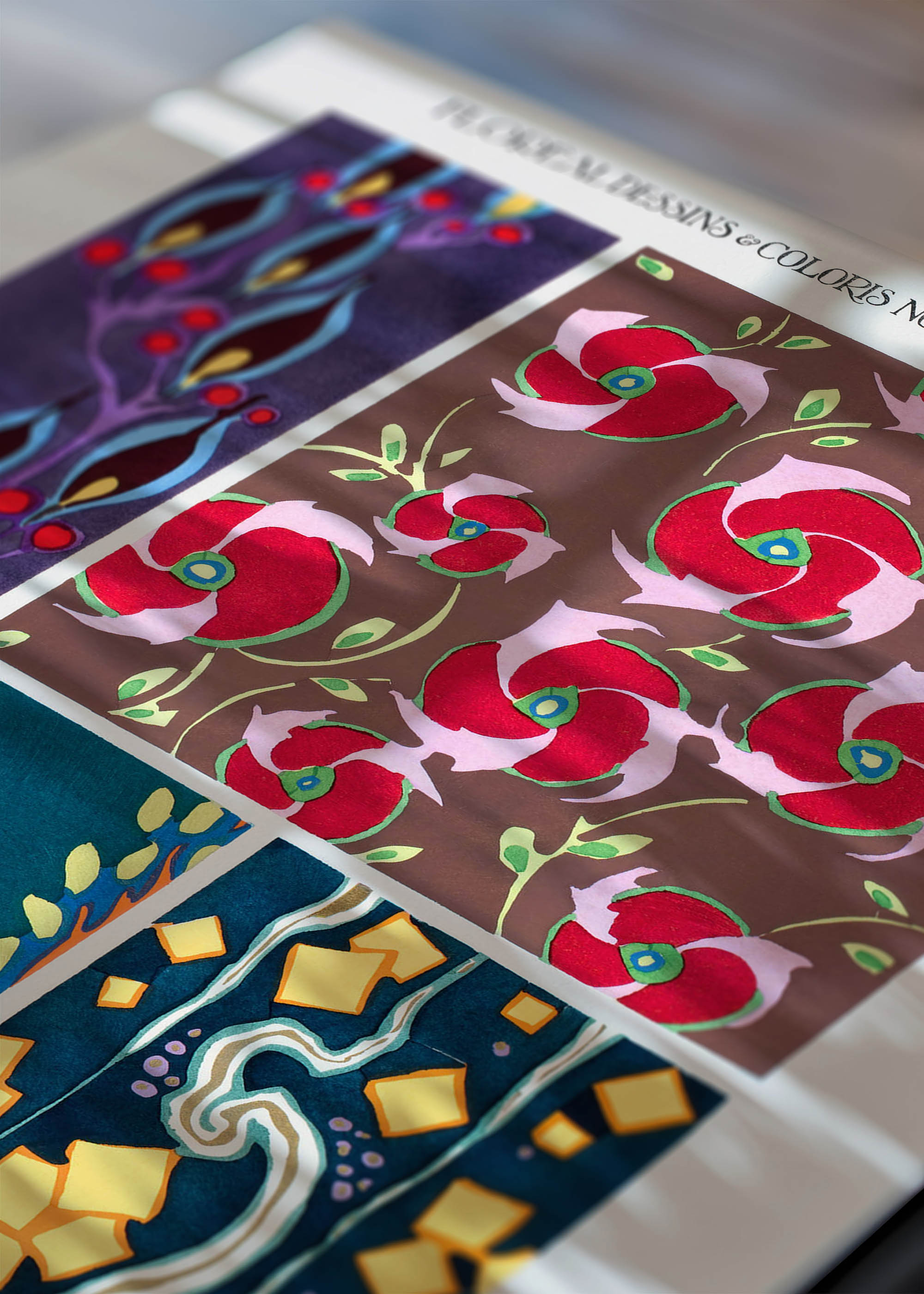 Kolorystyka prezentowanych kompozycji odzwierciedla typową dla tego okresu fascynację kontrastami – od głębokich ultramaryn i fioletów kadmowych w lewym górnym wzorze, przez ciepłe brązy ziemi kontrastujące z karminową czerwienią i różem pudru w prawym górnym motywie. Dolne kompozycje prezentują bogactwo turkusów i szmaragdów przeplatanych żółciami cytrynowymi oraz dramatyczne zestawienie granatów z żółtymi kwaratami geometrycznymi.