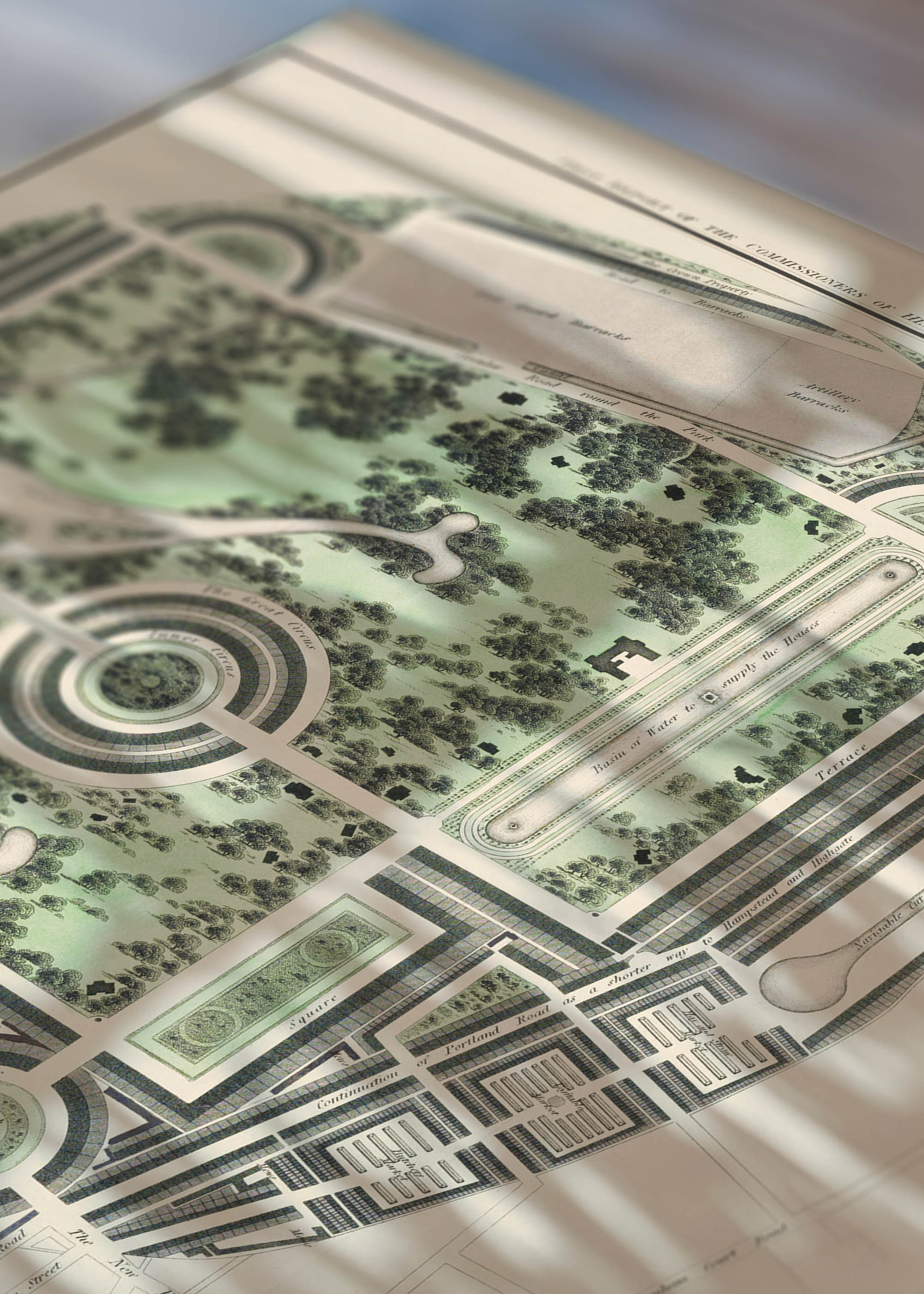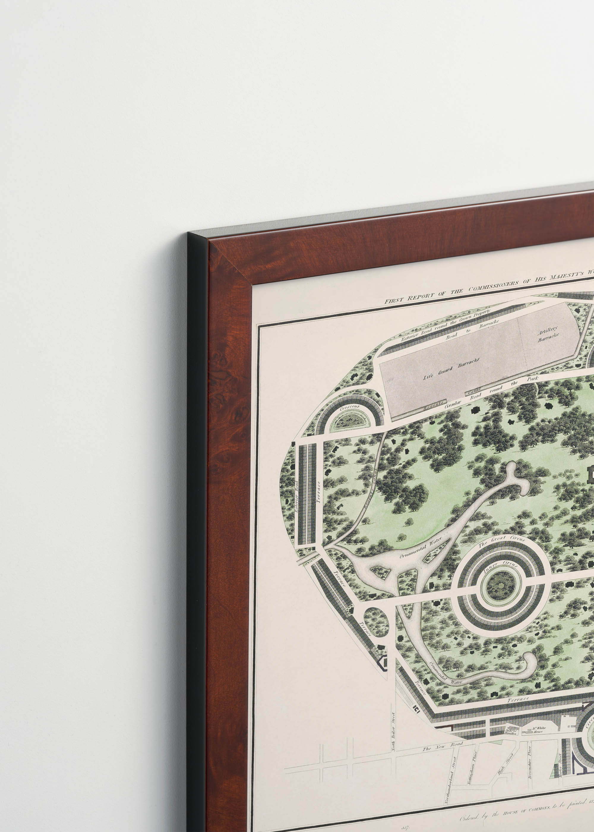 Ten niezwykły plakat przedstawia XVIII-wieczny plan ogrodu pałacowego Marybone Park Farm (Marylebone Park Farm), stanowiący reprodukcję oryginalnego projektu parku z epoki oświecenia. Dokument kartograficzny pochodzi najprawdopodobniej z okresu 1750-1800, kiedy to sztuka ogrodowa przeżywała swój złoty wiek w Europie. Był to czas, gdy architekci krajobrazu tworzyli monumentalne założenia parkowe dla arystokracji, łącząc elementy geometryczne z naturalistycznymi.