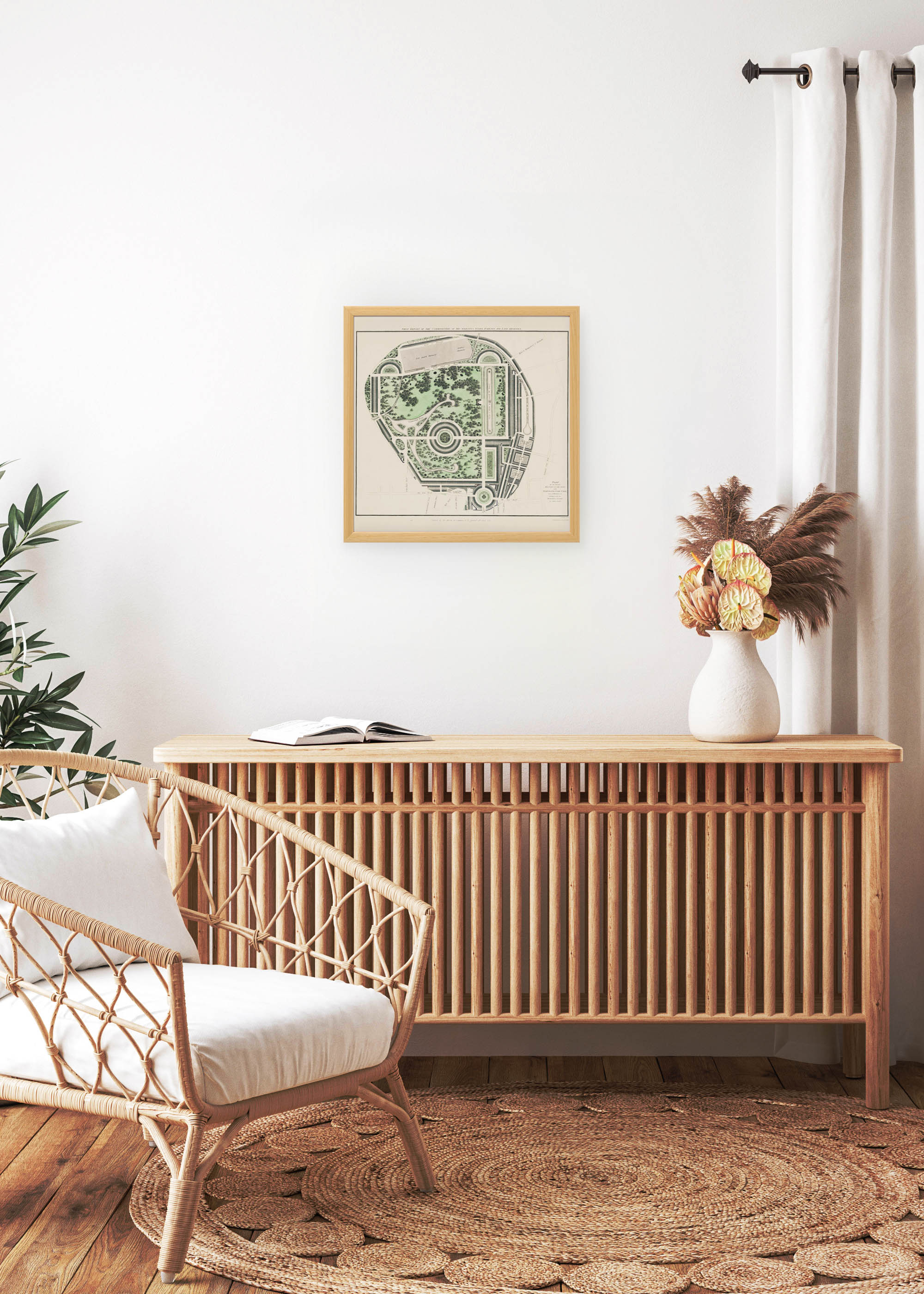 To prawdziwa gratka dla miłośników historycznej kartografii i sztuki ogrodowej! Plakat idealnie wpasuje się w klasyczne wnętrza urządzone w stylu francuskim lub angielskim, ale równie dobrze sprawdzi się jako elegancki akcent w nowoczesnym salonie czy gabinecie. Plakatello poleca go szczególnie do pomieszczeń z meblami w ciepłych odcieniach drewna, gdzie będzie harmonizował z bursztynowymi i miodowymi tonami.