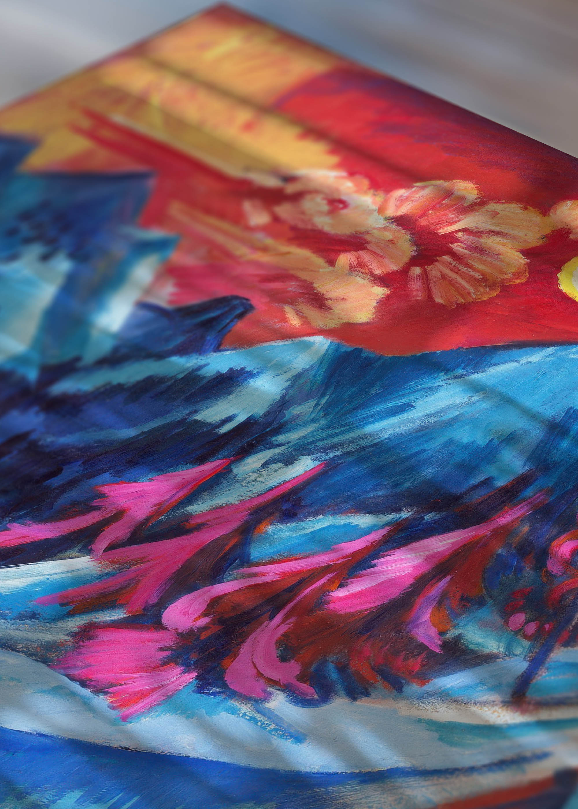 Ta fascynująca kompozycja zachwyca intensywną kolorystyką, w której dominują kobaltowe i pruskie błękity górskich szczytów, kontrastujące z płomiennymi akcentami kadmowej czerwieni i chromowego żółcienia rozpalającego niebo. Magentowe i fuksjowe tony iglastych drzew tworzą nieoczekiwaną harmonię z chłodnymi tonacjami śniegu, podczas gdy w tle kłębią się chmury w odcieniach koralowej pomarańczy.