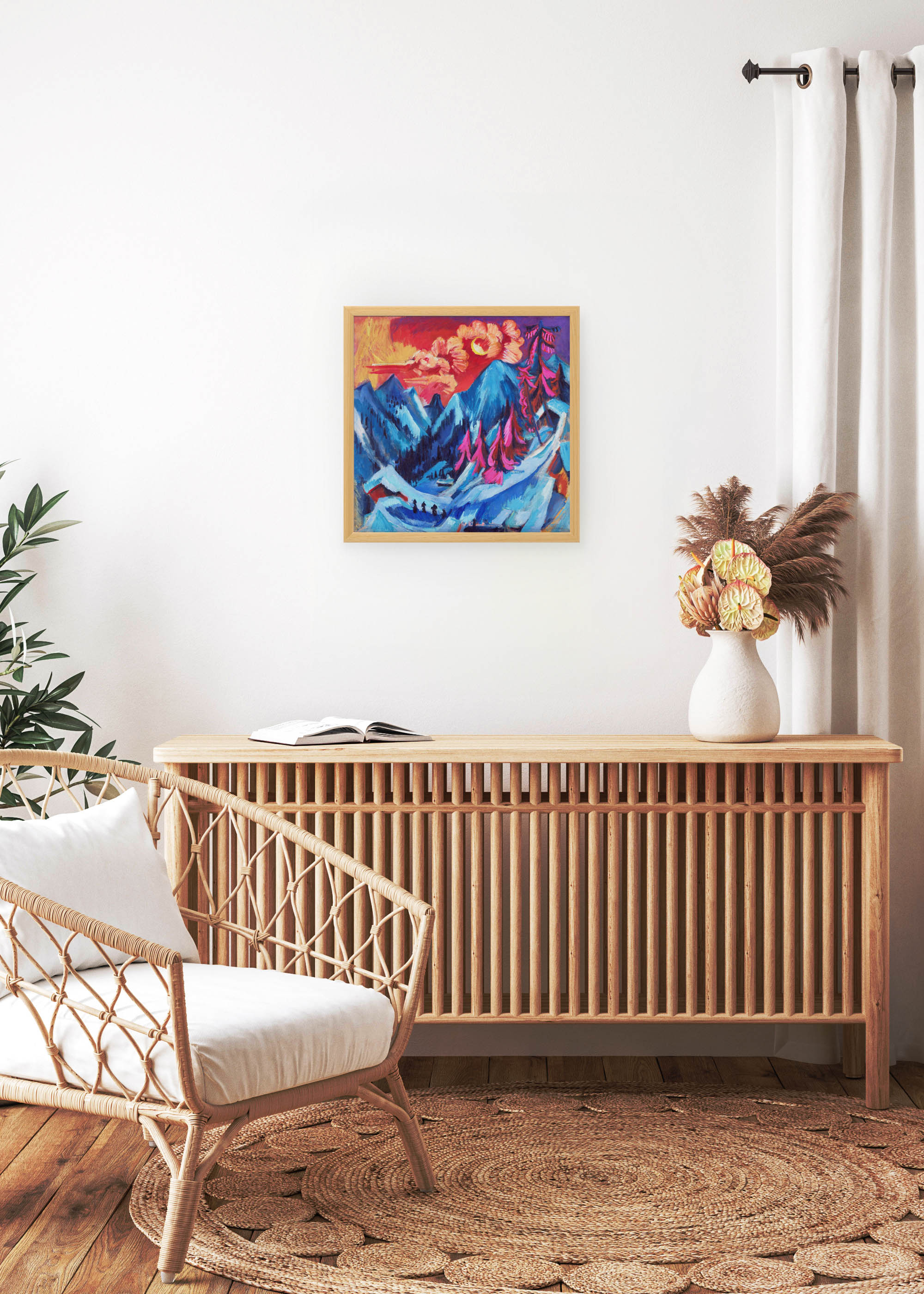 Plakat będący reprintem dzieła pt. Zimowy pejzaż w świetle księżyca Ernsta Ludwiga Kirchnera z 1919 r. przenosi nas wprost w pulsujący świat niemieckiego ekspresjonizmu początku XX wieku. Kirchner, założyciel grupy artystycznej Die Brücke, tworzył w okresie wielkich przemian społecznych i kulturowych, a jego alpejskie pejzaże z lat 1917-1926 powstały podczas pobytu w szwajcarskich Alpach, gdzie artysta szukał uzdrowienia po traumach I wojny światowej.