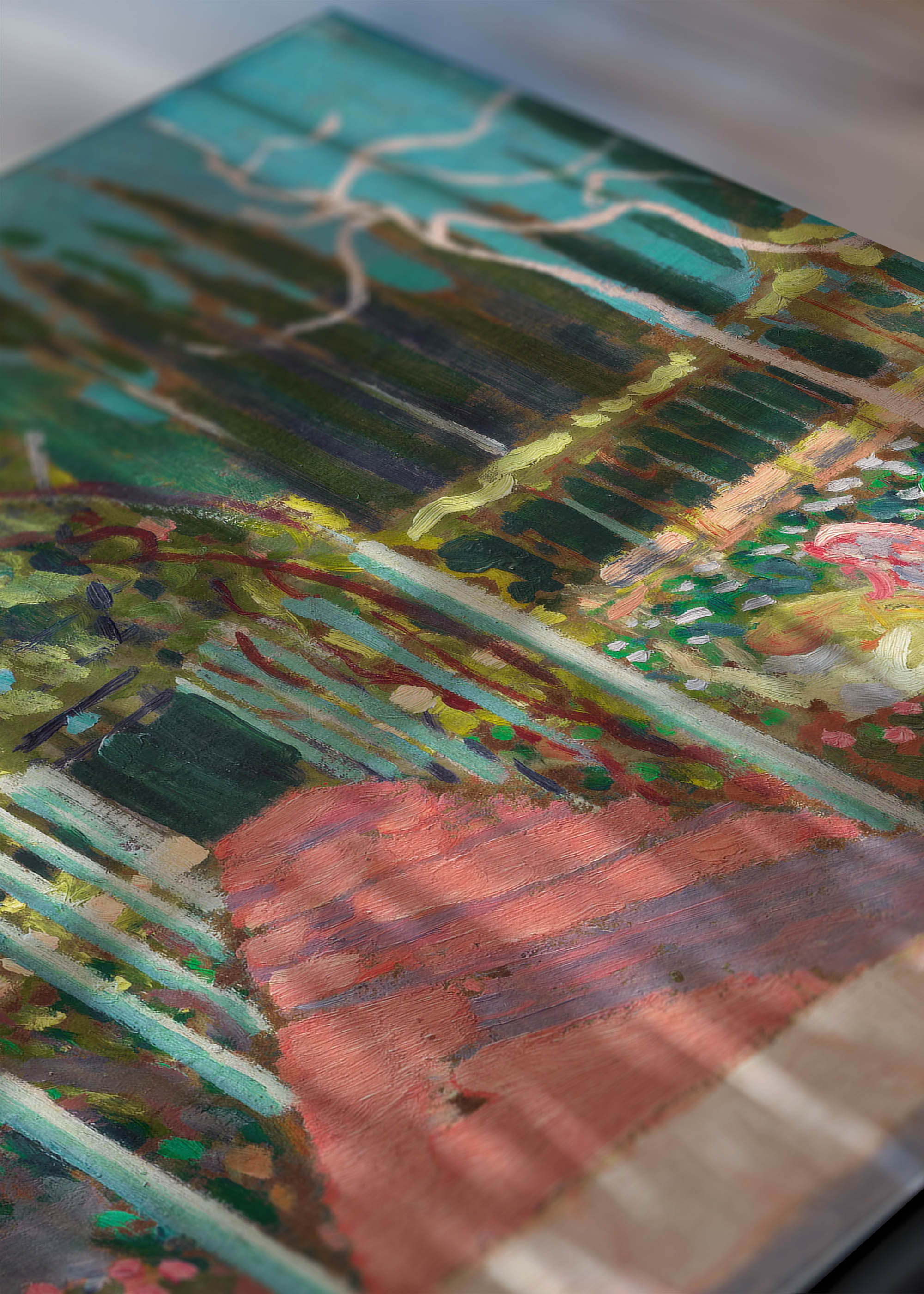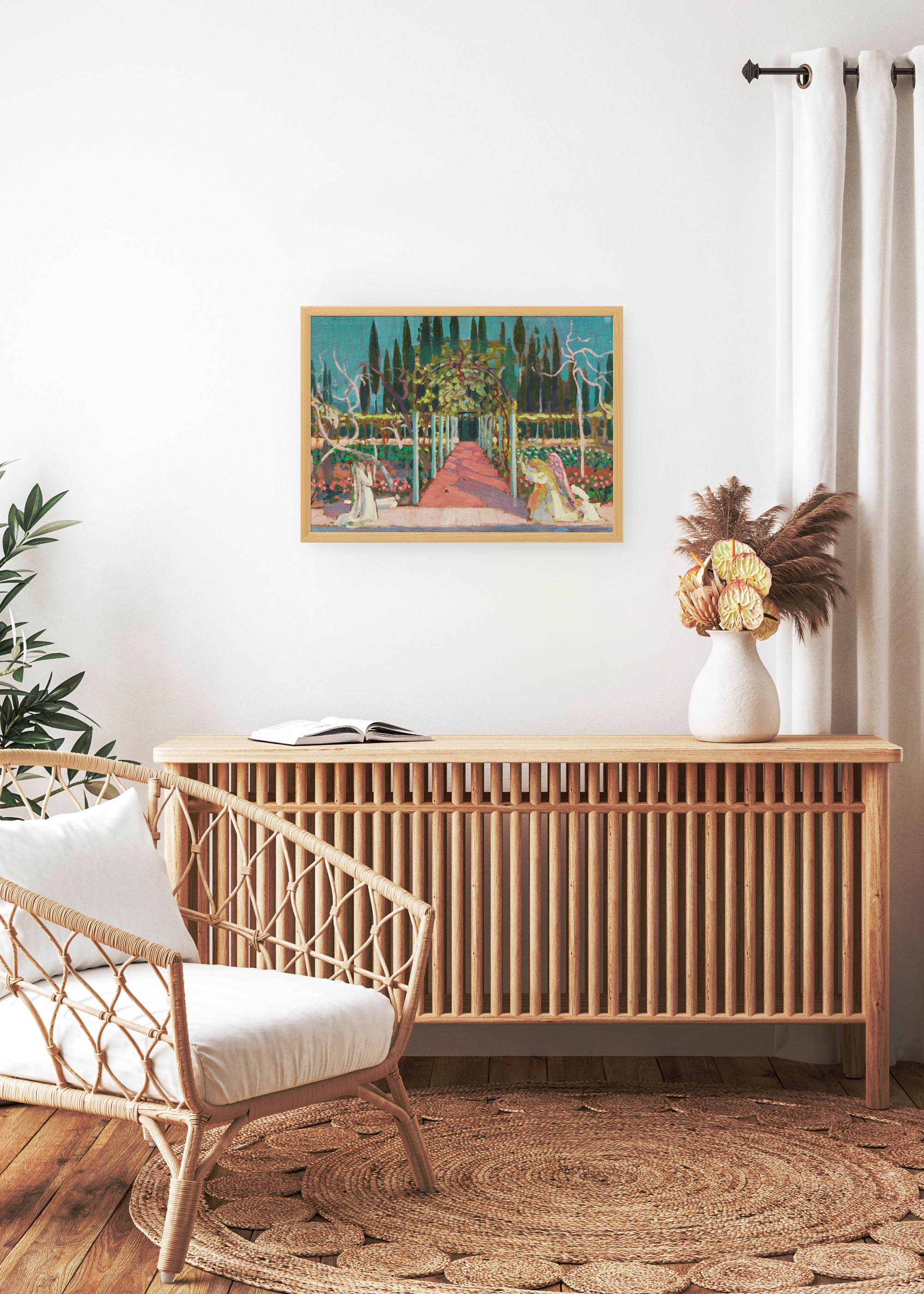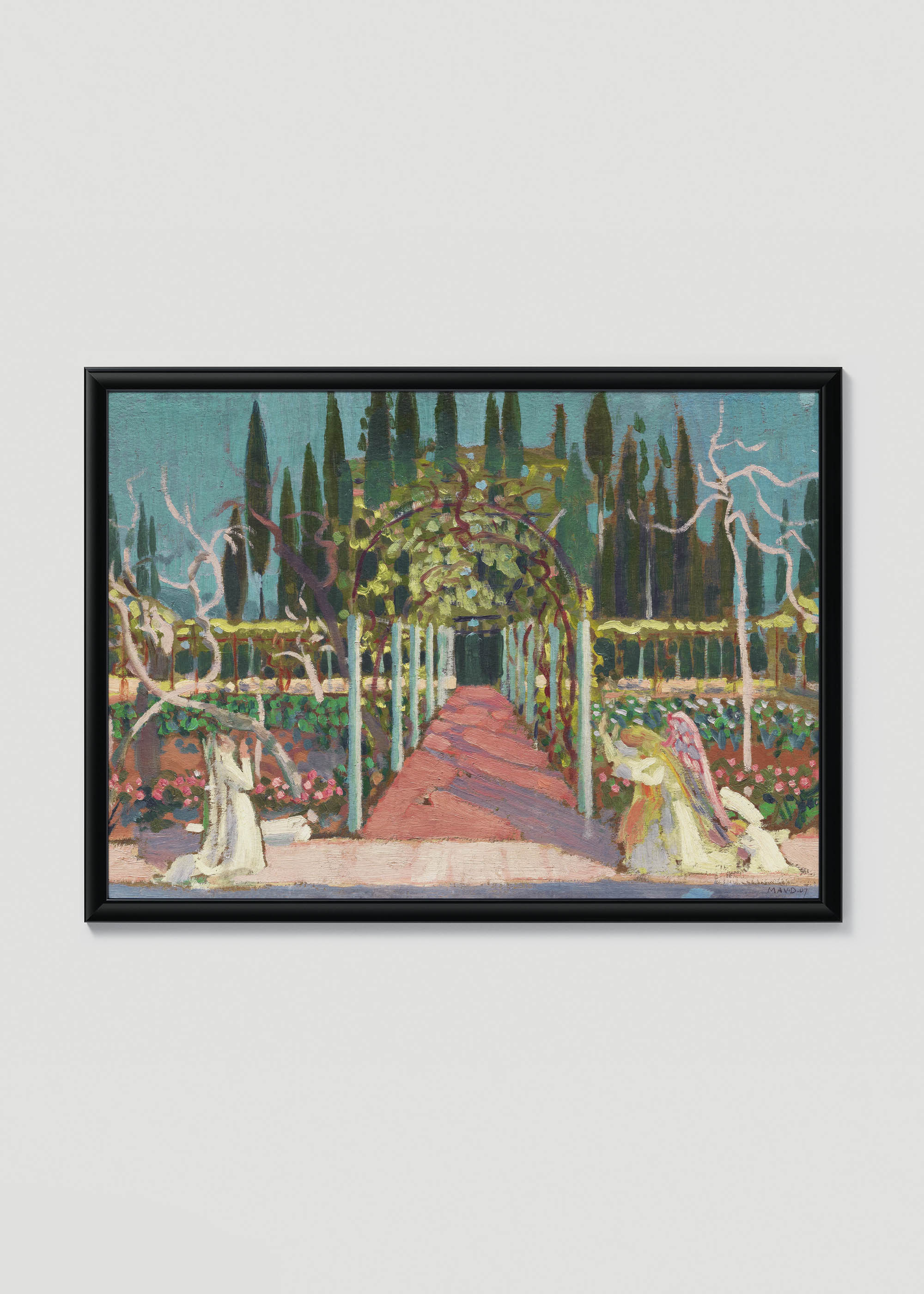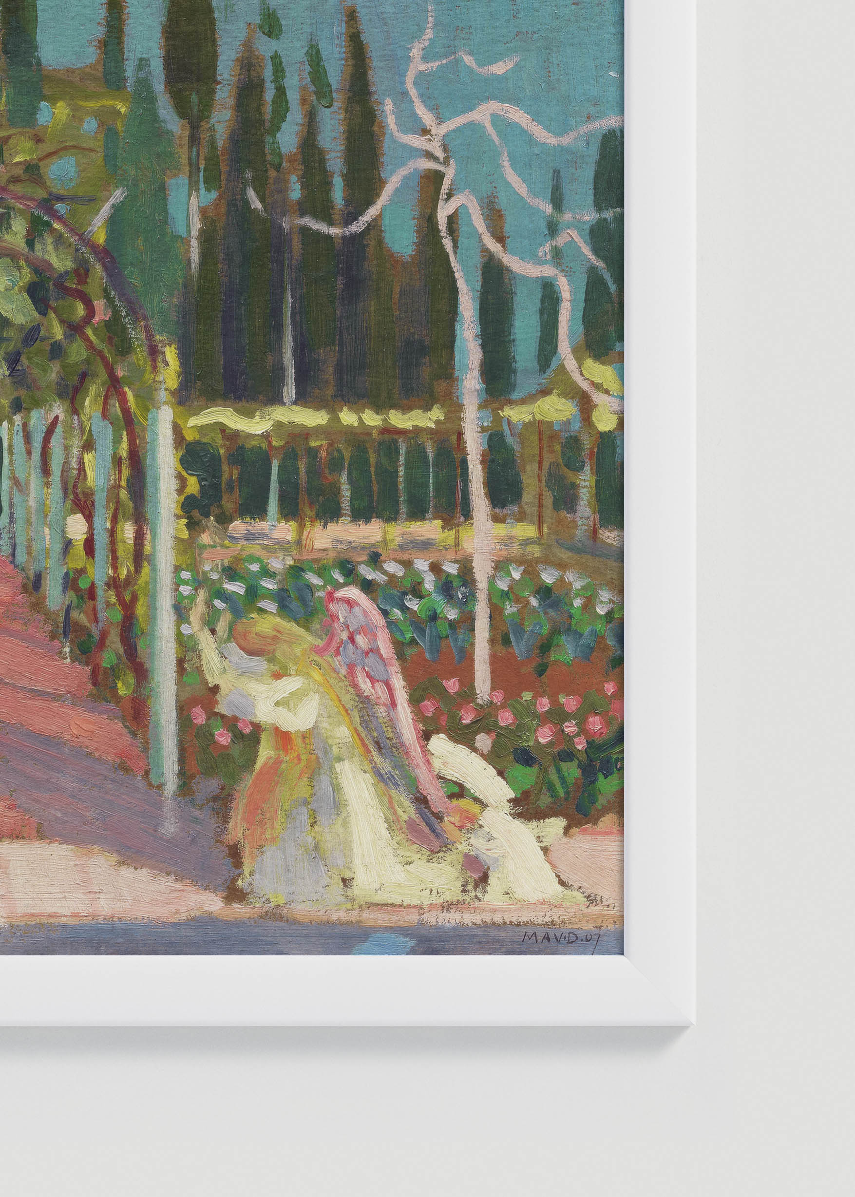 Kompozycja urzeka harmonijnym połączeniem turkusowej lazury nieba z soczystą zielenią cyprysów, które niczym strażnicy otaczają ogród. Centralnym punktem jest malownicza pergola opleciona winoroślą, której liście mienią się w tonach złocistej żółci i karmazynowej czerwieni. Przed nią klęczą dwie postacie: kobiety oraz anioła. Czerwona ceglasta ścieżka prowadzi wzrok przez kompozycję, tworząc przestrzenną głębię charakterystyczną dla stylu Denisa. Białe kolumny pergoli kontrastują z bogactwem kolorystycznym, podczas gdy różowe akcenty kwiatów dodają delikatności całości.